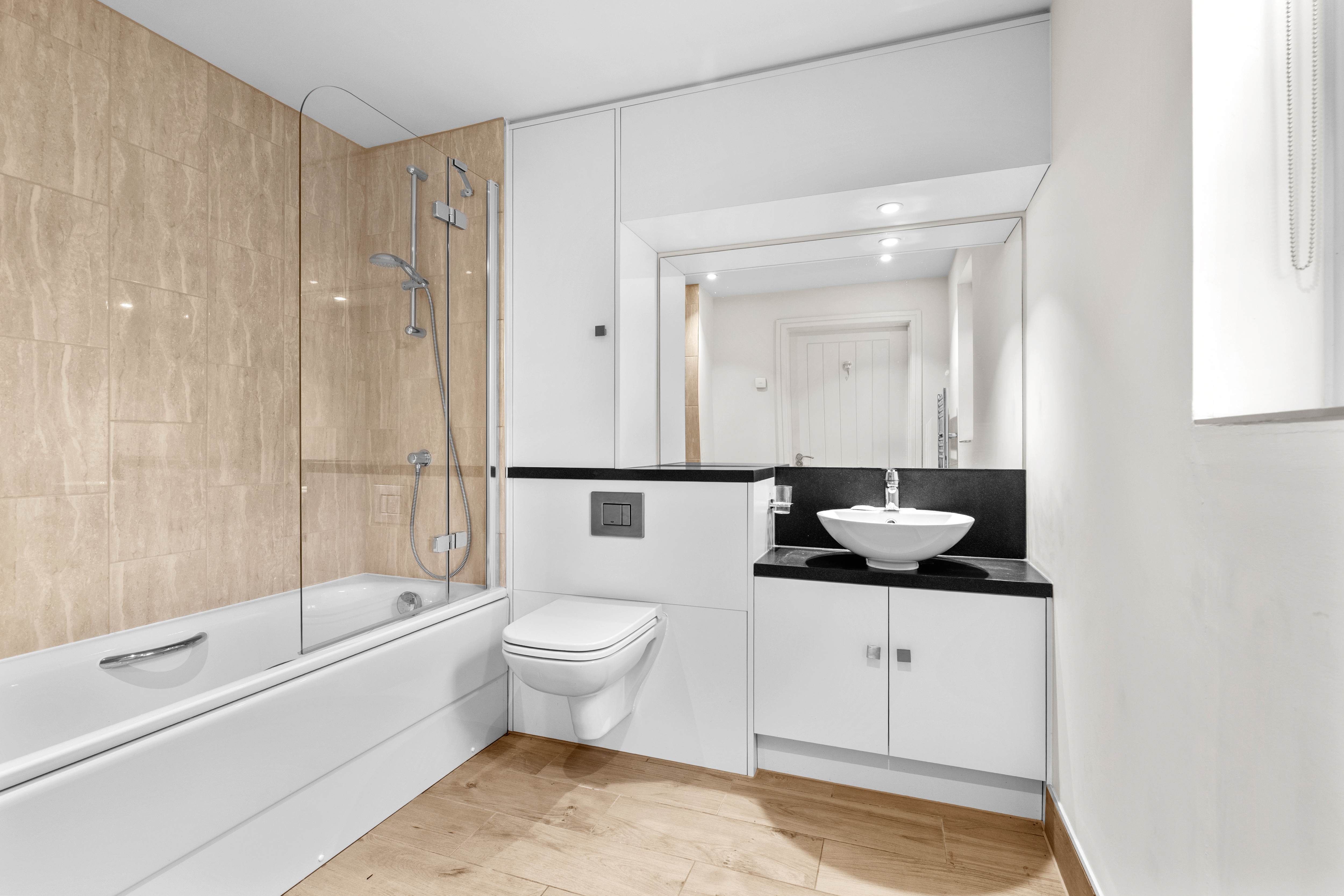 - Glass screens to shower with chrome shower controls