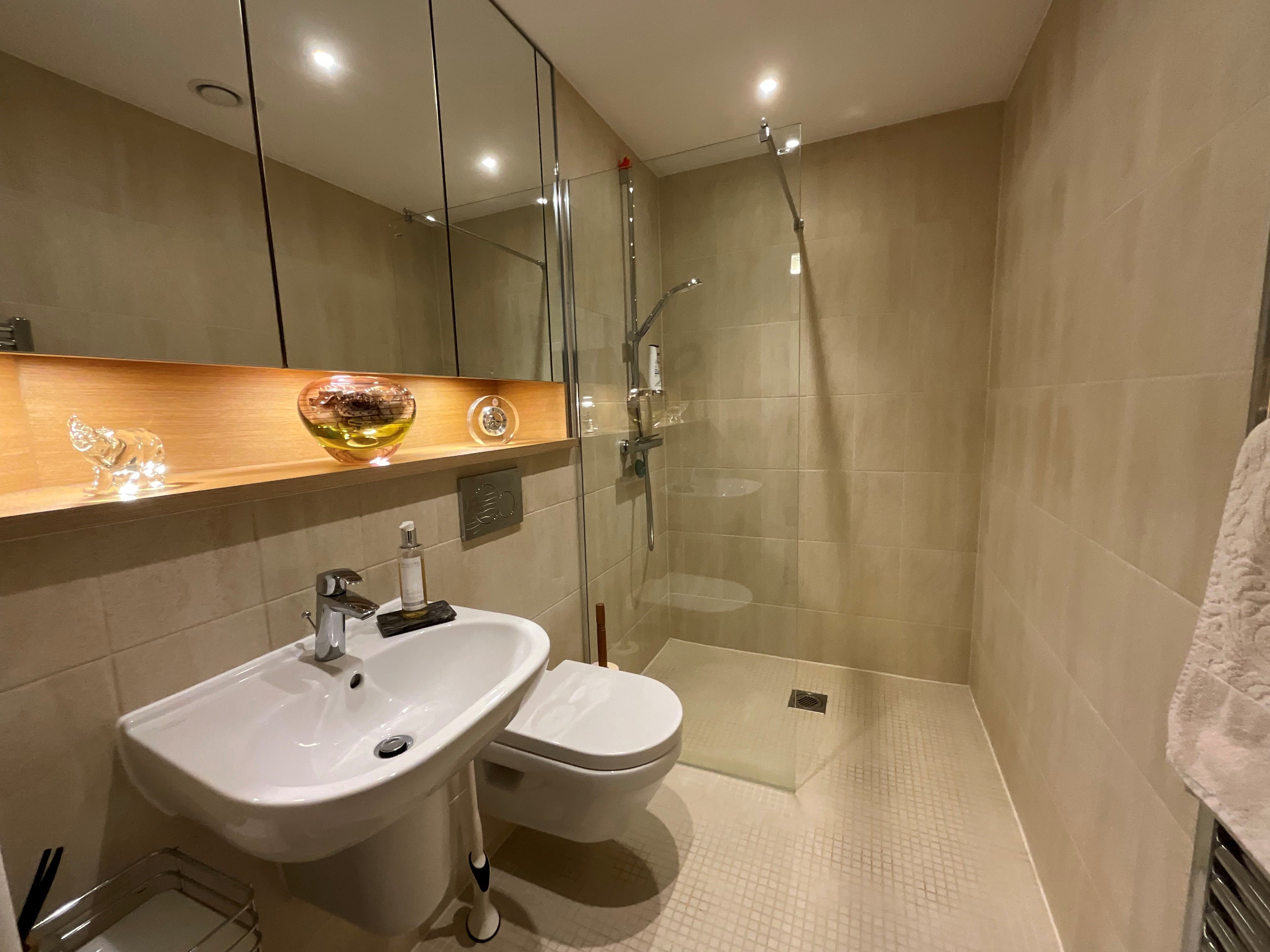- Glass screens to shower with chrome shower controls