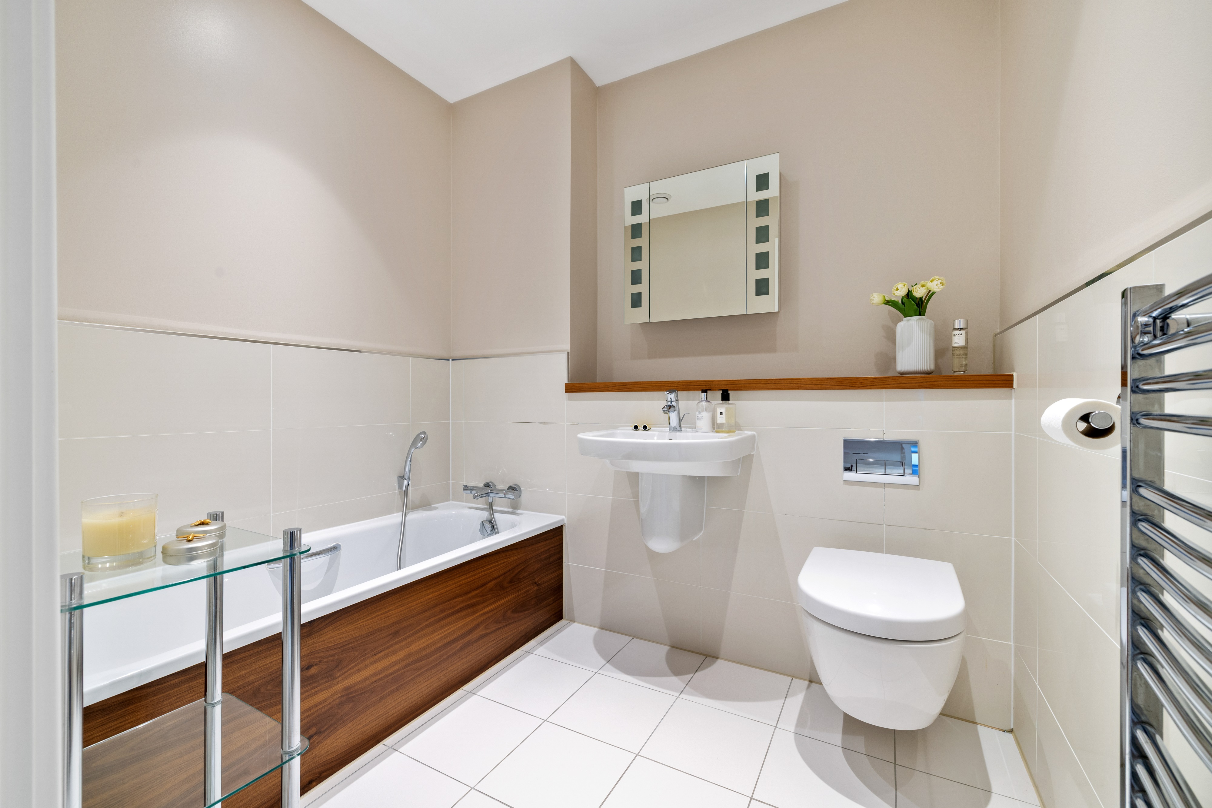 - Ceramic tiles to full height in bath and shower areas