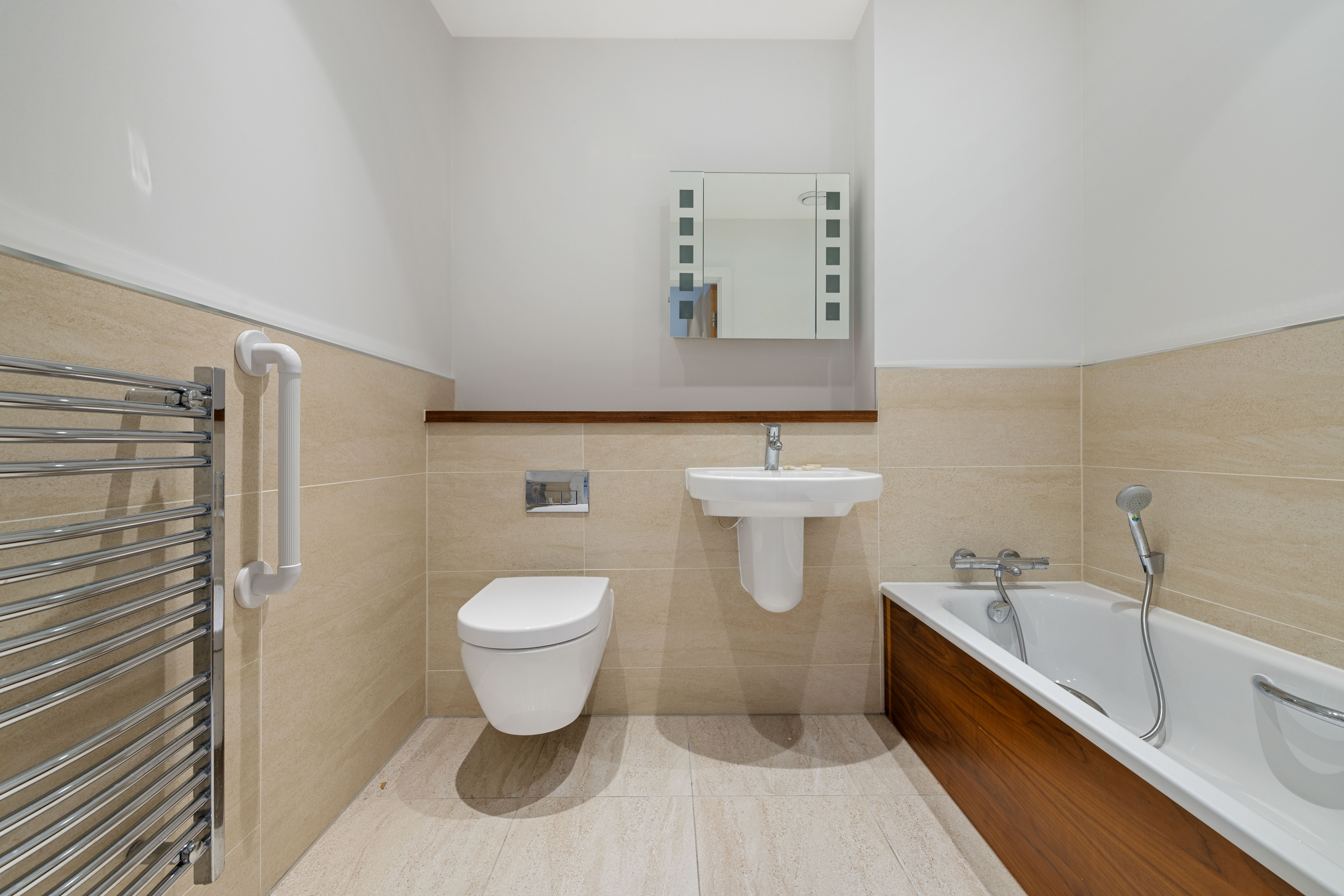 - Ceramic tiles to full height in bath and shower areas