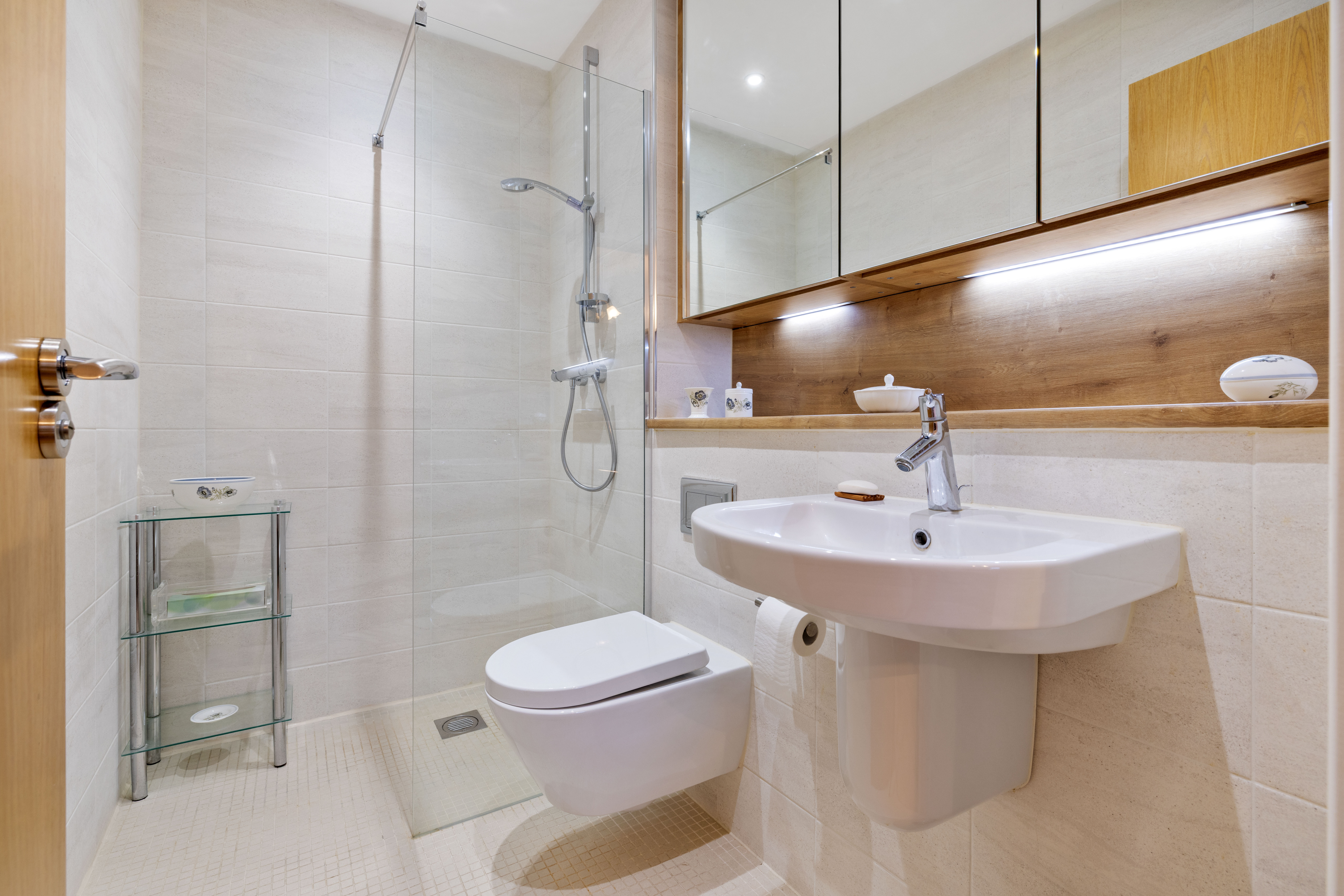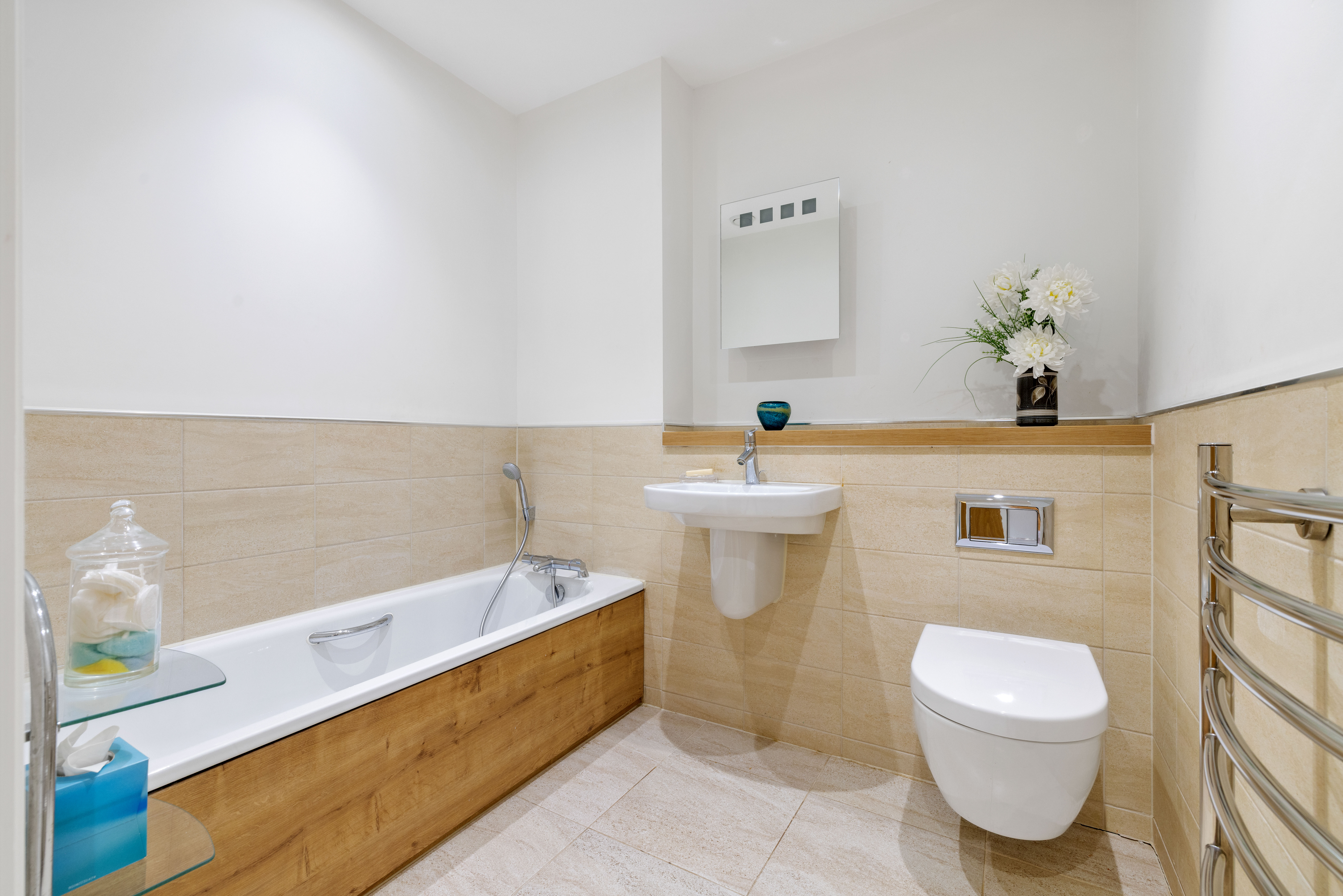 - Ceramic tiles to full height in bath and shower areas