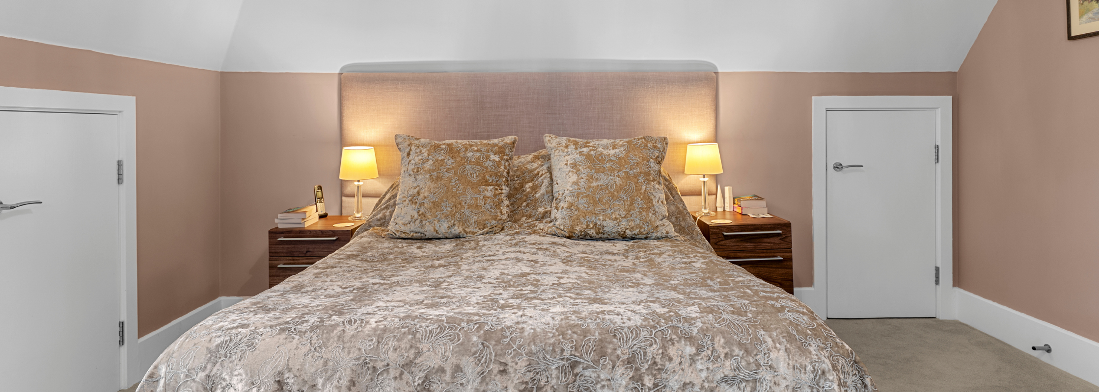 The spacious master bedroom includes fitted wardrobes and convenient eaves storage, while the north-west-facing patio offers an ideal space for outdoor relaxation.