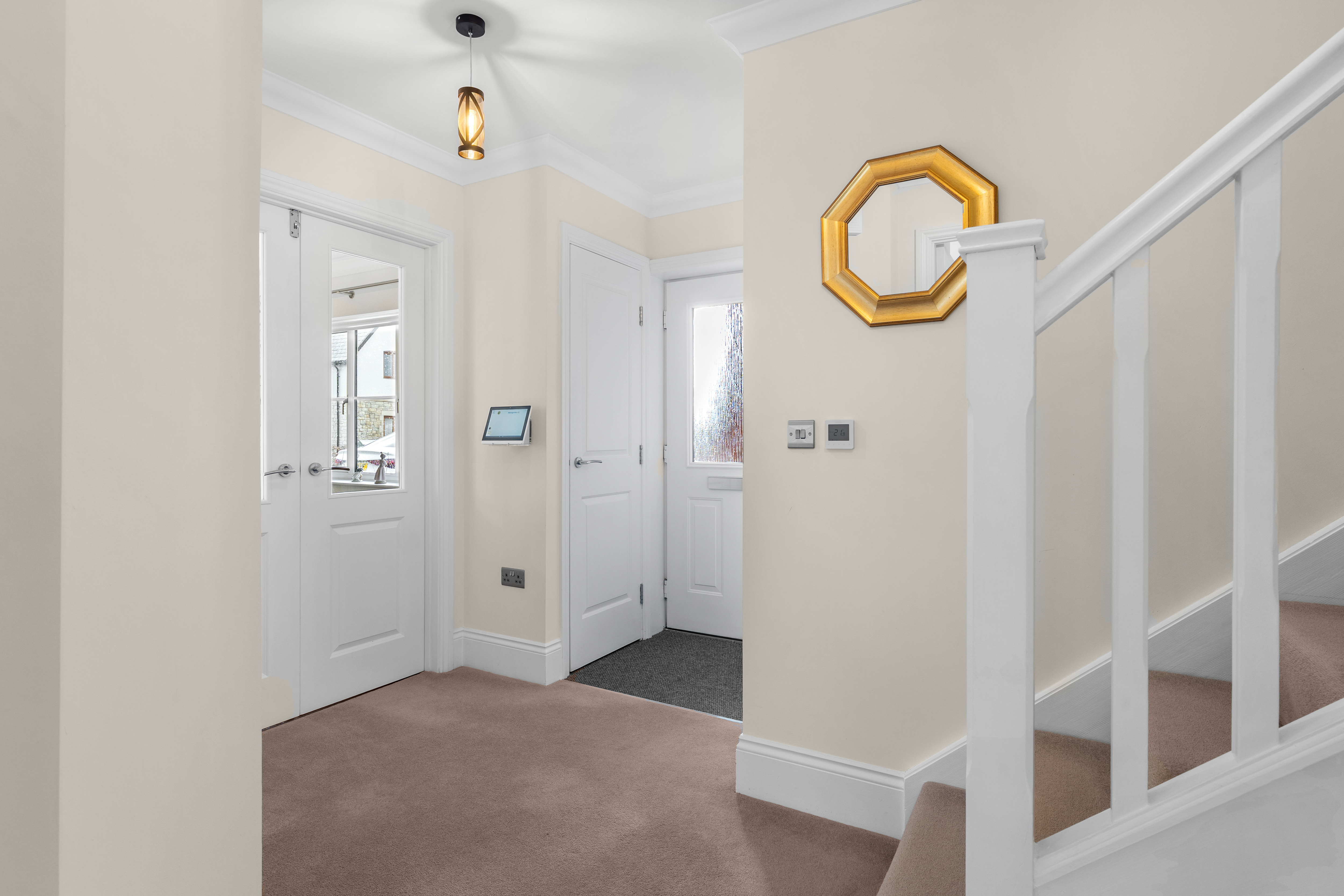 - Painted panelled doors (cottages) or oak veneered flush doors (apartments) with elegant brushed metal door furniture
