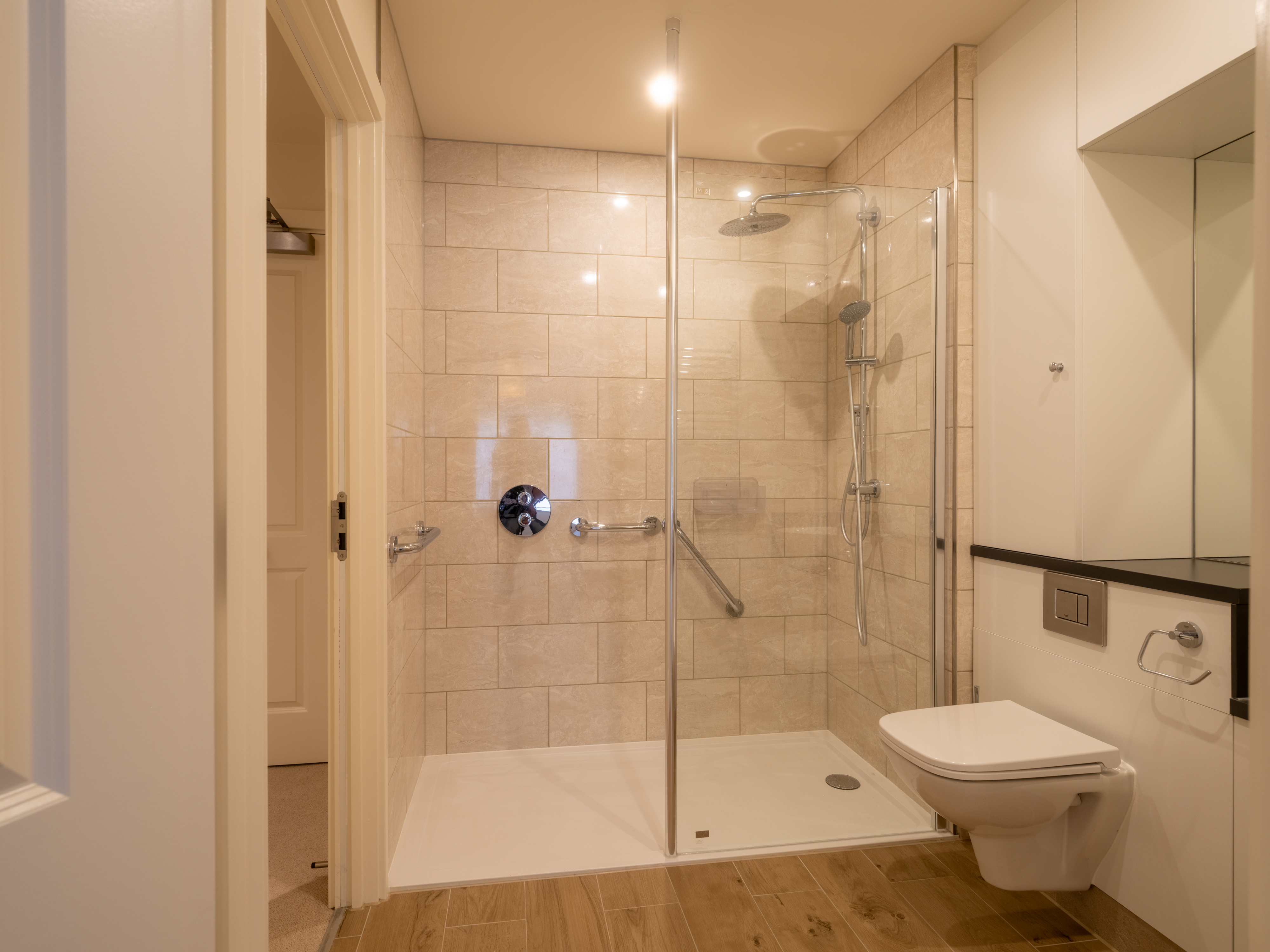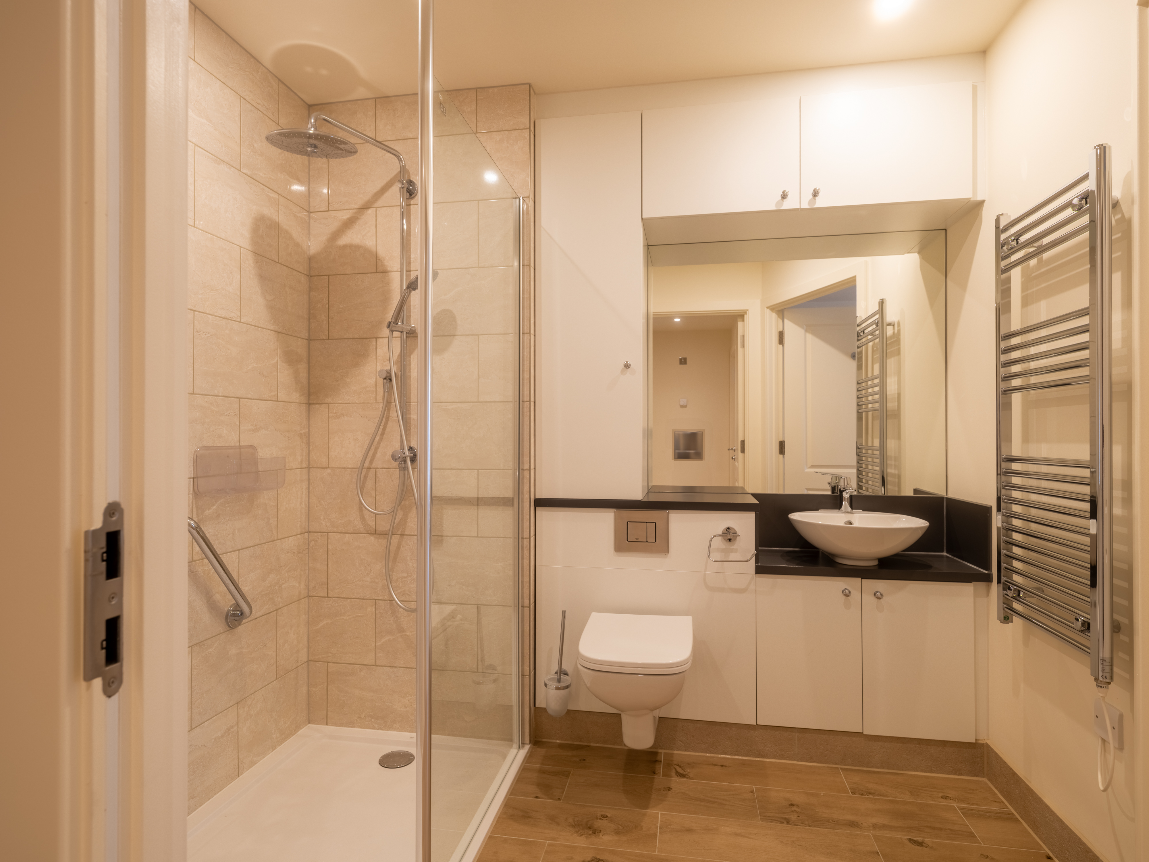 - Glass screens to shower with chrome shower controls
