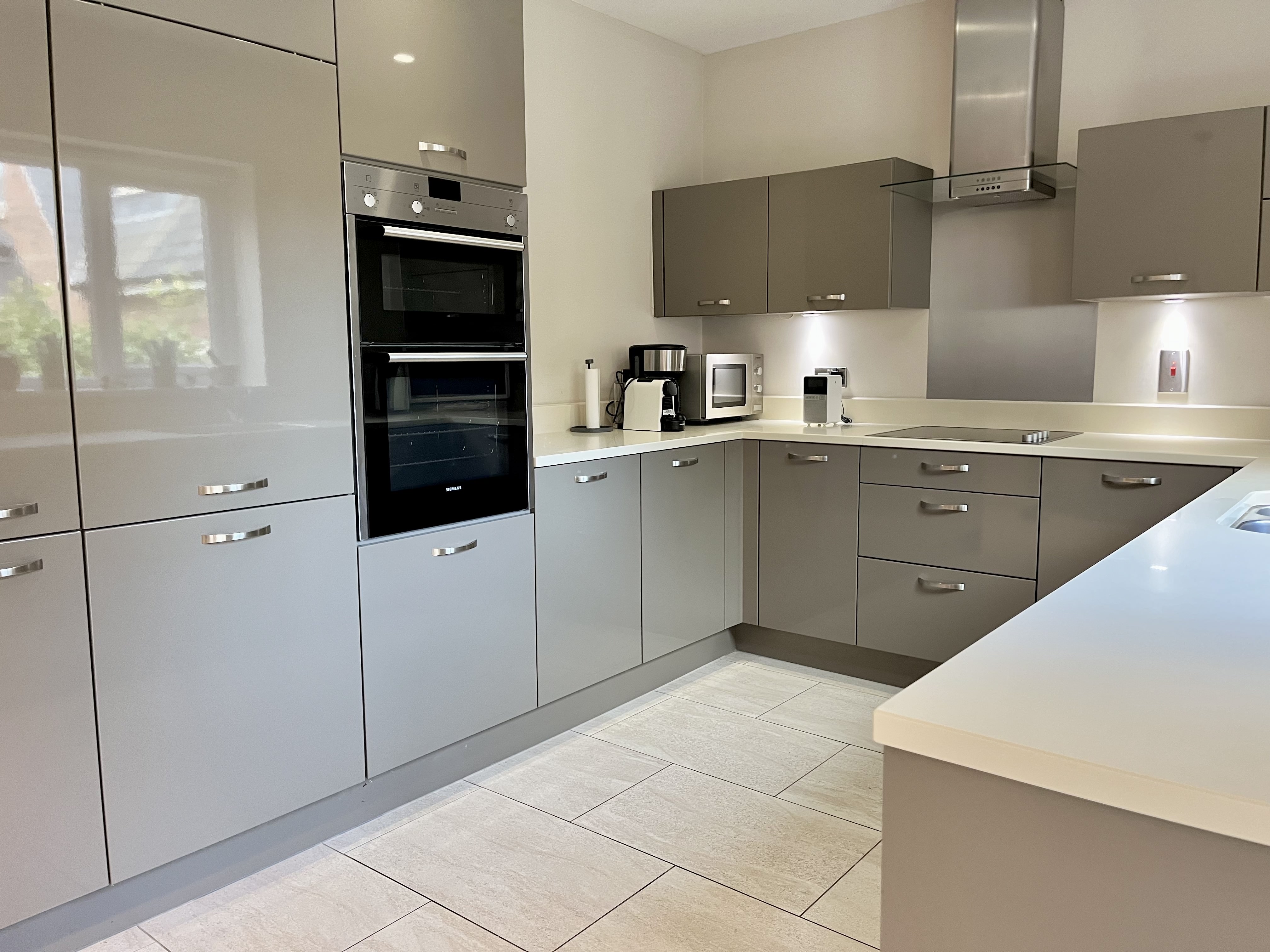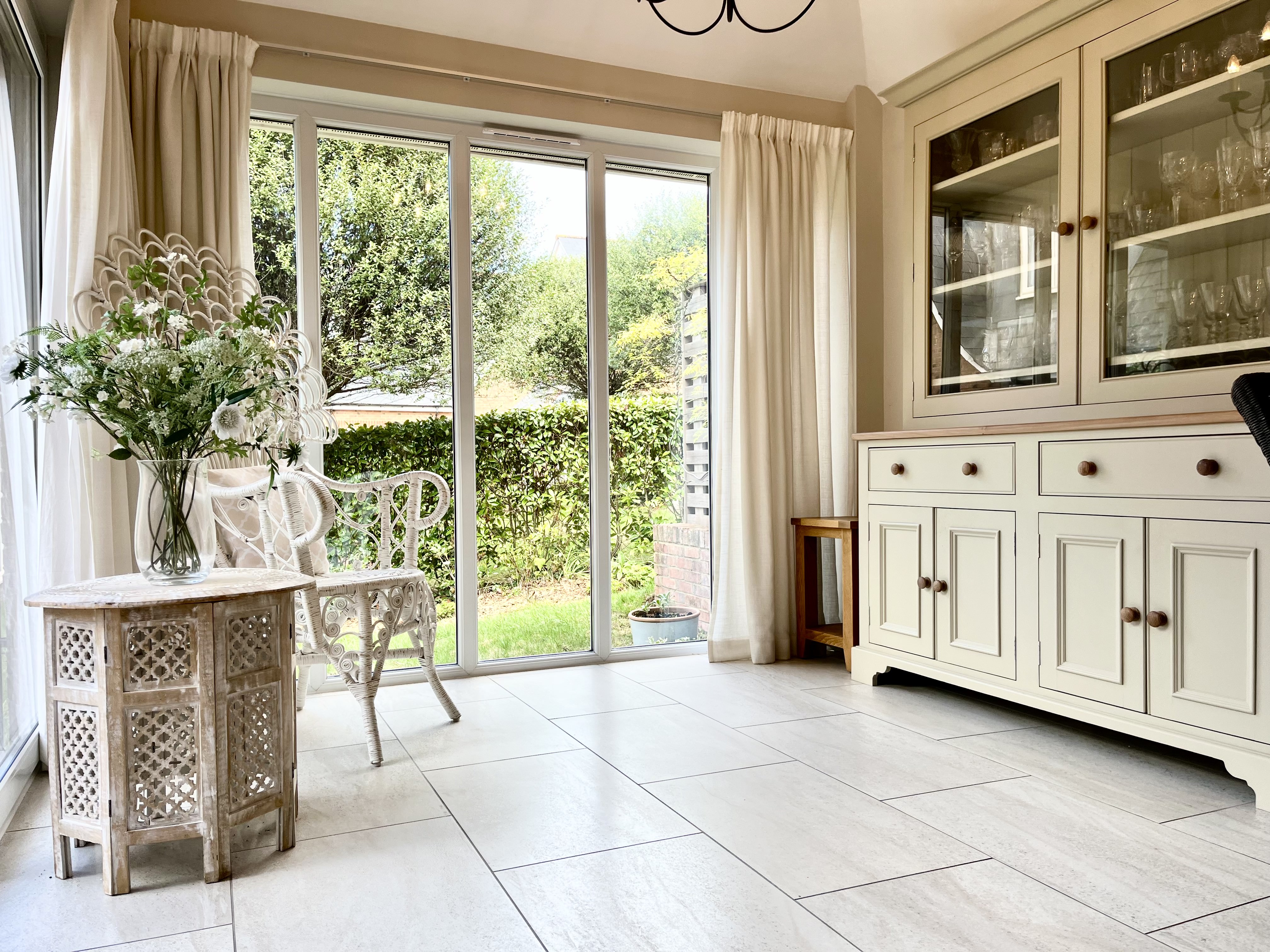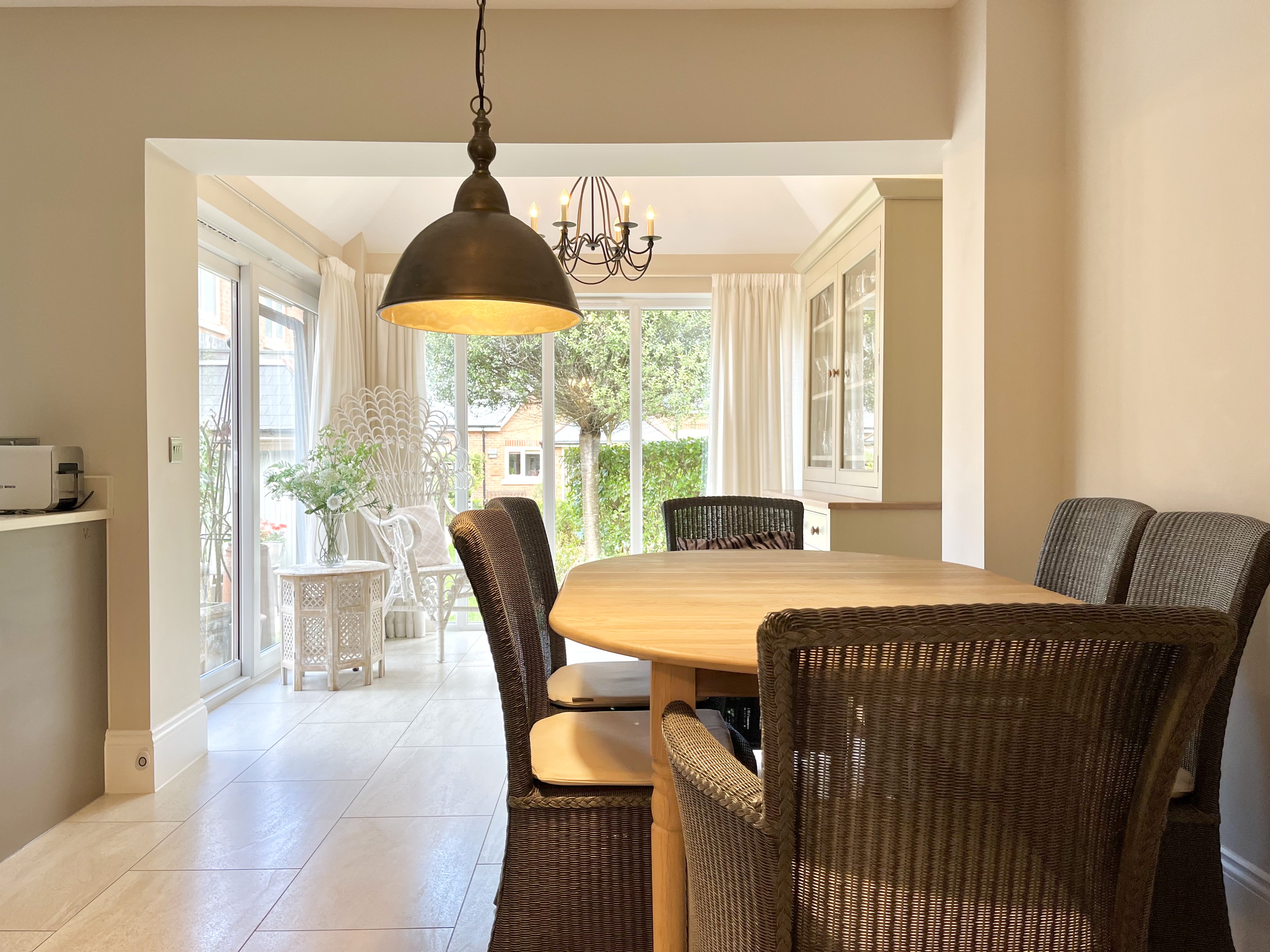 The light and airy living room flows seamlessly into a fully fitted kitchen and dining area, which in turn opens into a bright garden room with a private patio — ideal for relaxing or entertaining.